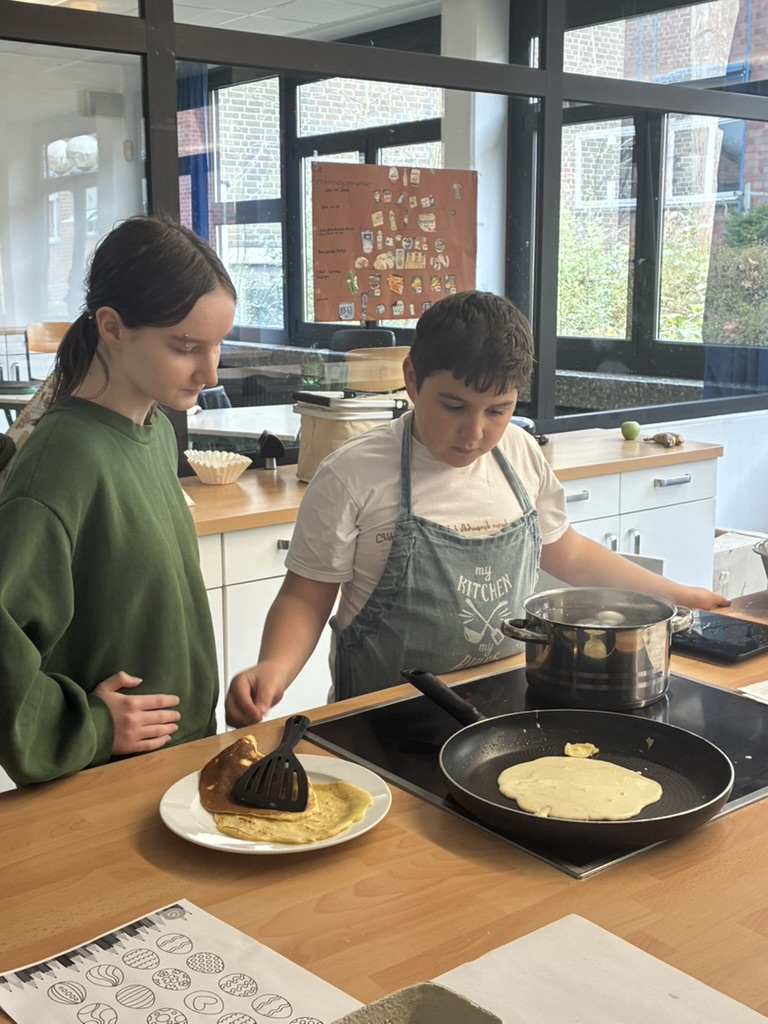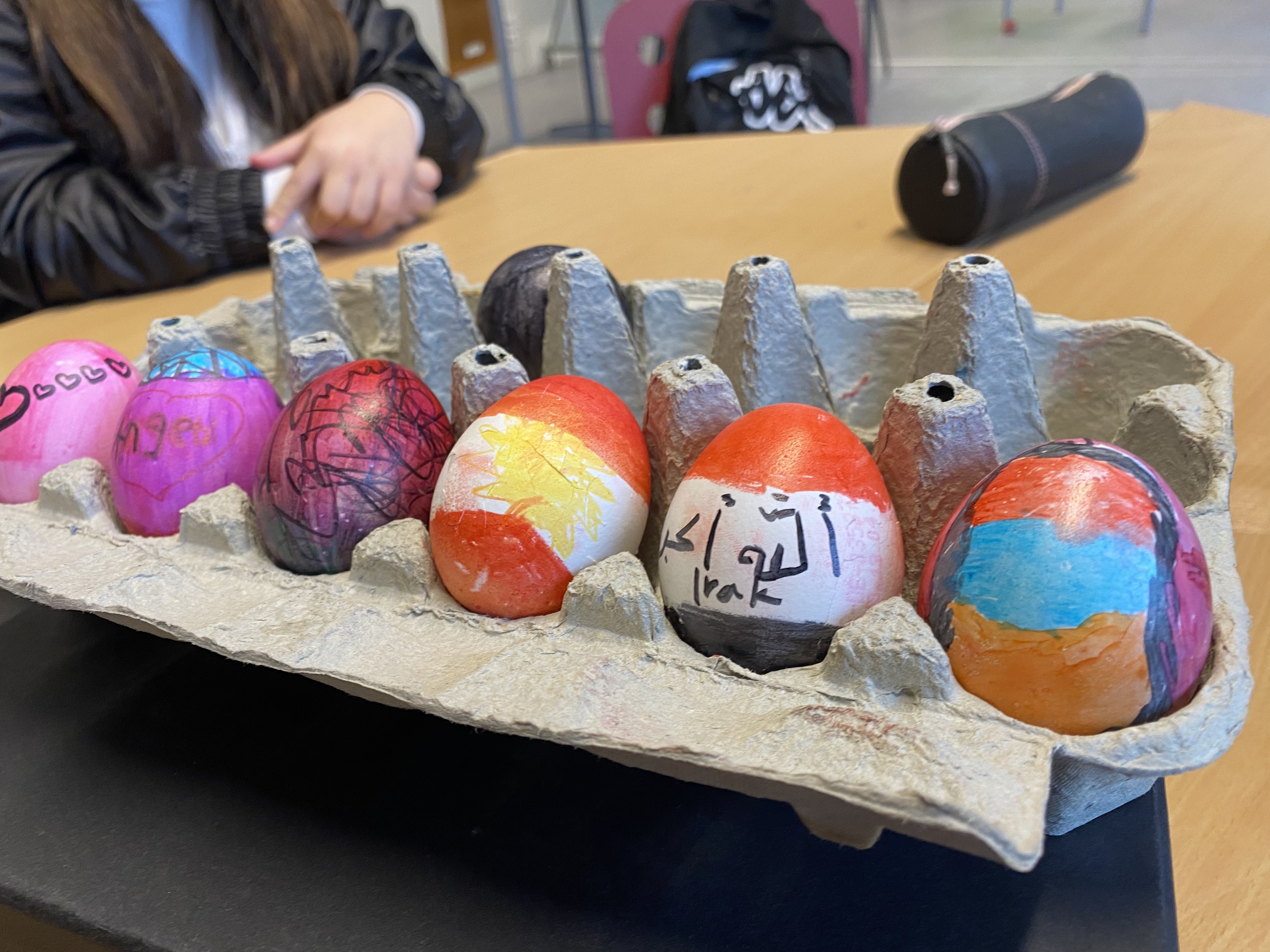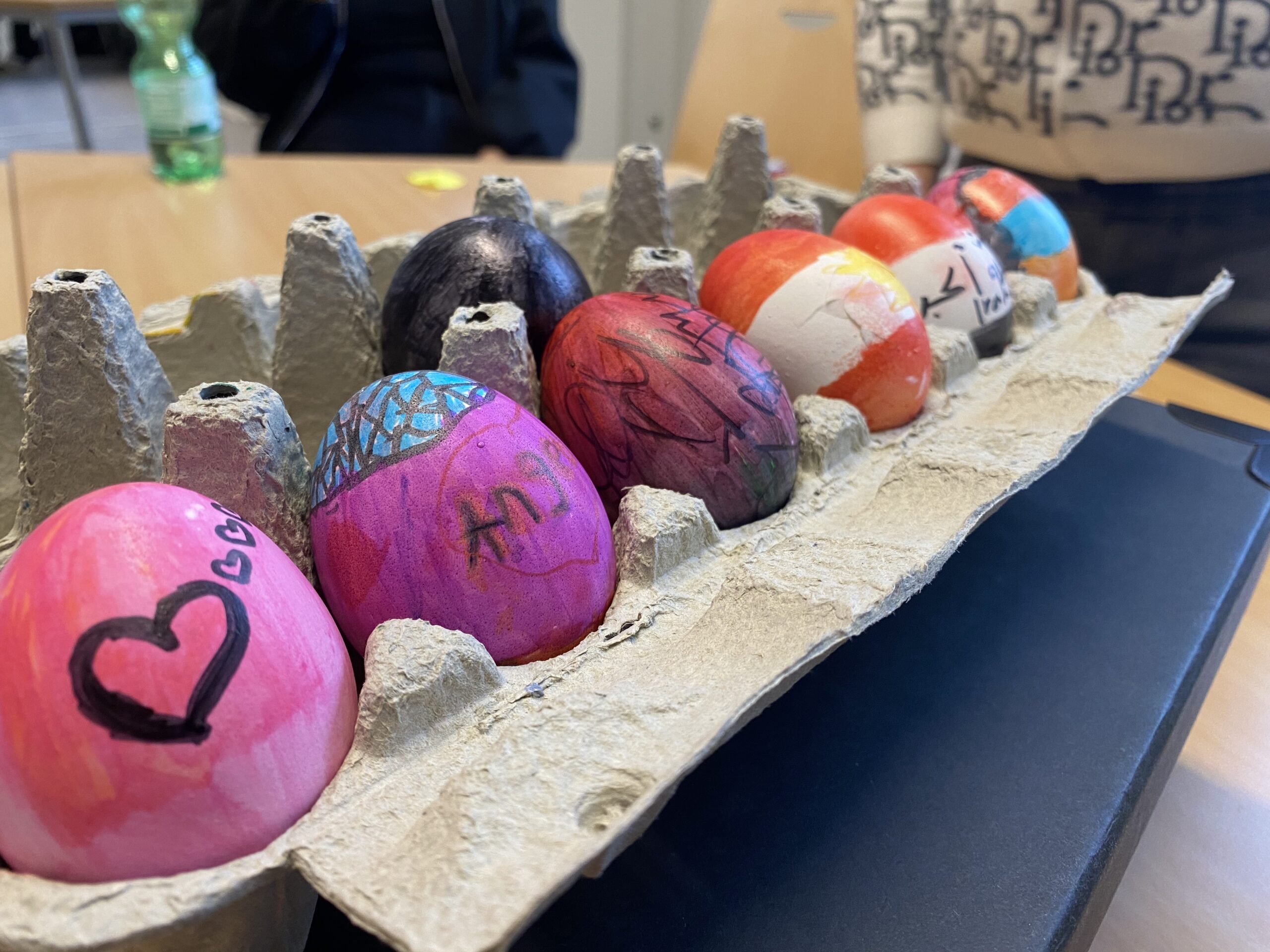 Auch in der darauffolgenden Woche wurde es in der DAZ-Gruppe kreativ und frühlingshaft: Passend zur Osterzeit wurde gemeinsam gebacken, Eier wurden gekocht und anschließend bunt bemalt. Ein besonderes Highlight war zudem, dass der Osterhase auf unserem Schulhof kleine Schokoladenüberraschungen versteckt hatte, die von den Schülerinnen und Schülern mit großer Begeisterung gesucht und gefunden wurden.